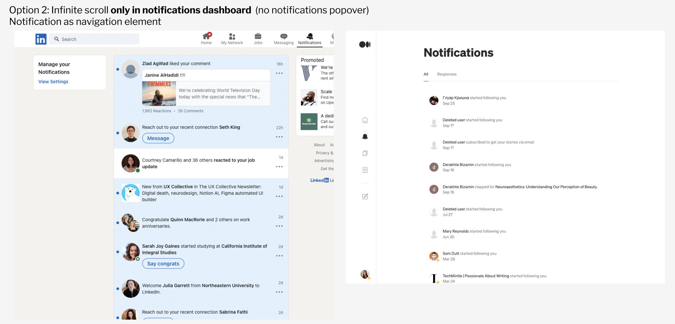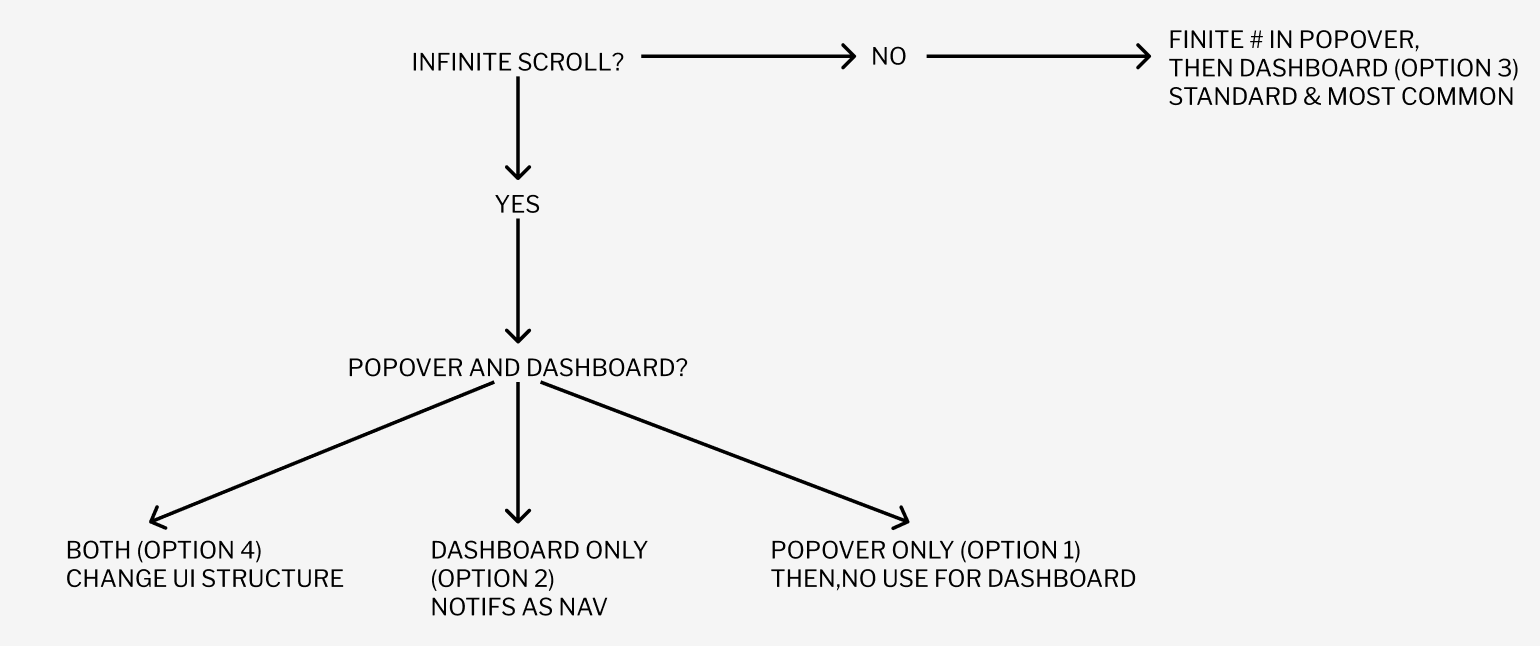 Before designing, I conducted some research on common UI patterns for notification popovers, as we were debating moving away from infinite scroll.